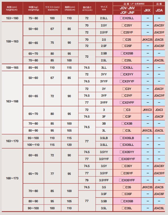 158~163 サイズ2.5(標準体型)、2.5Y(細め)、2.5L(太め)